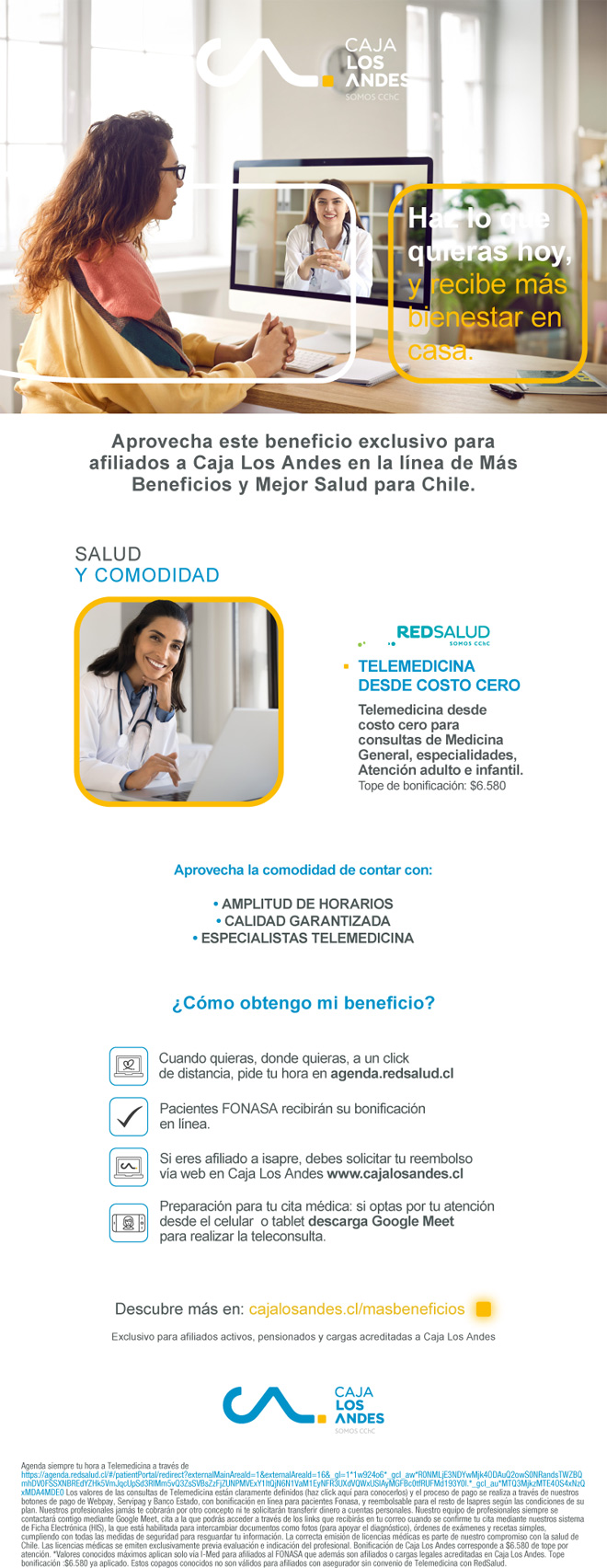 Es un servicio que permite a las y los afiliados de Caja Los Andes agendar consultas médicas en línea con profesionales de RedSalud, desde la comodidad de su hogar y utilizando dispositivos con conexión a internet.